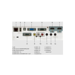 HDMI IN, COMPUTER 1 IN, COMPUTER 2 IN/MONITOR OUT, VIDEO IN, S-VIDEO IN, AUDIO IN1, AUDIO IN2 (MIC IN), AUDIO IN3, AUDIO OUT, SERIAL IN, LAN USB A&B (memory / Wireless Module & display)